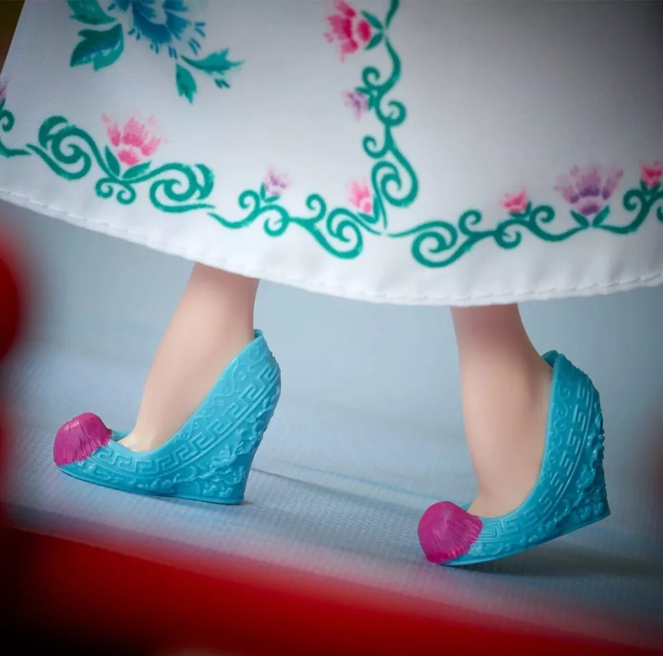Barbie is enchanting in a traditional xifu costume, inspired by the beauty of Peking Opera, a cultural treasure of China and often performed to celebrate Lunar New Year and other Chinese holidays. Her elegant robe in lucky red with a colorful peony print symbolizes good fortune. Her dramatic water sleeves are uséd to create beautiful hand motions and expressions on stage. The look is completed with an ornate headdress with peony accents and cyan blue shoes with pink poms.