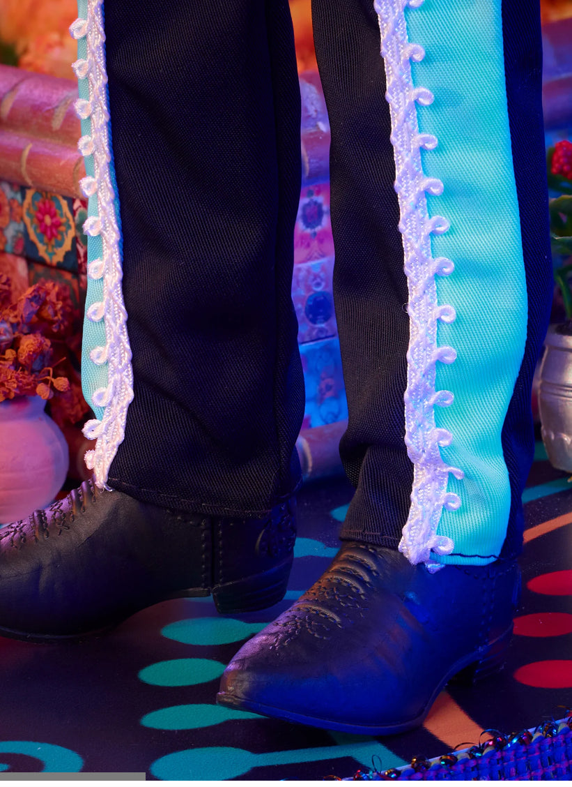 Ken doll looks striking in a black satiny suit with turquoise accents and embroidered details. He completes his look with calavera face paint, a silver belt, and a wide-brimmed sombrero. While sold separately, both Barbie and Ken dolls wear complimentary patterns, making them a perfect set and the ultimate keepsake that inspires joy and elegance.