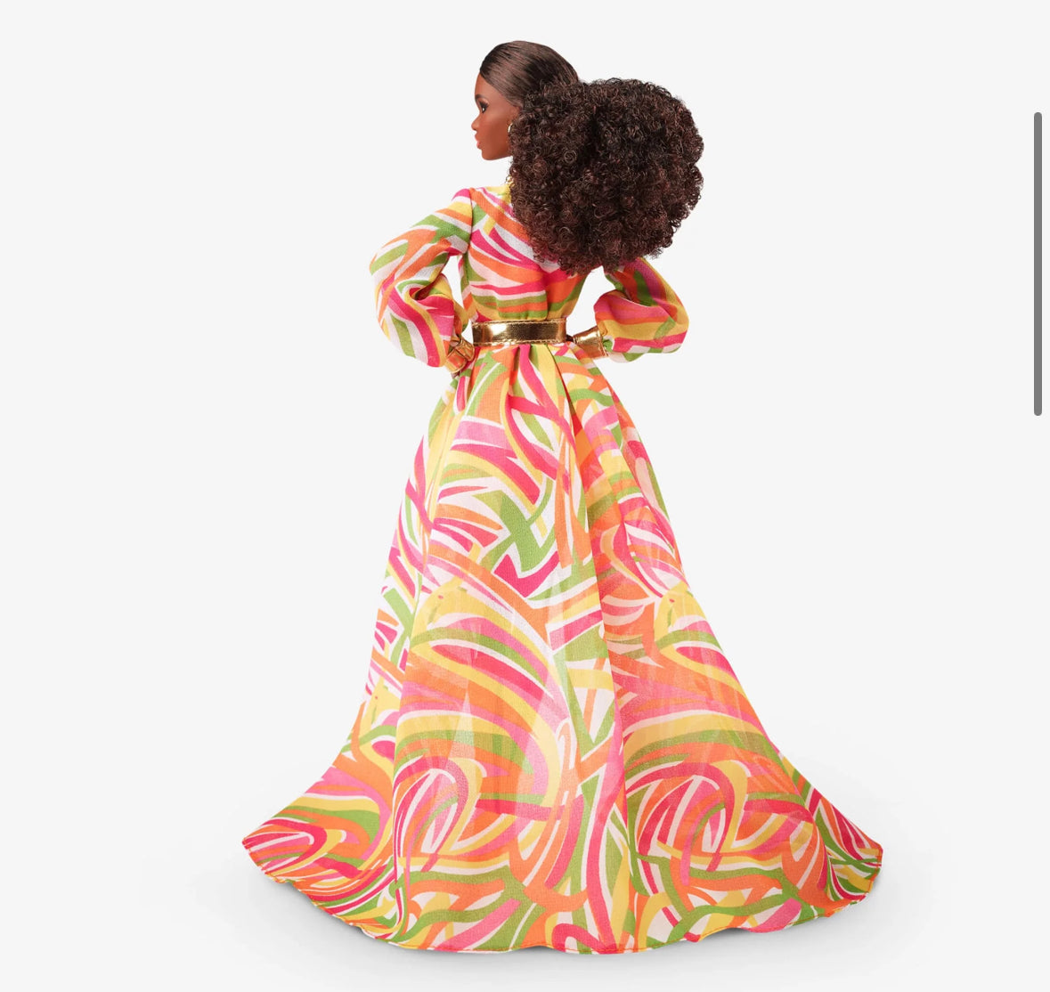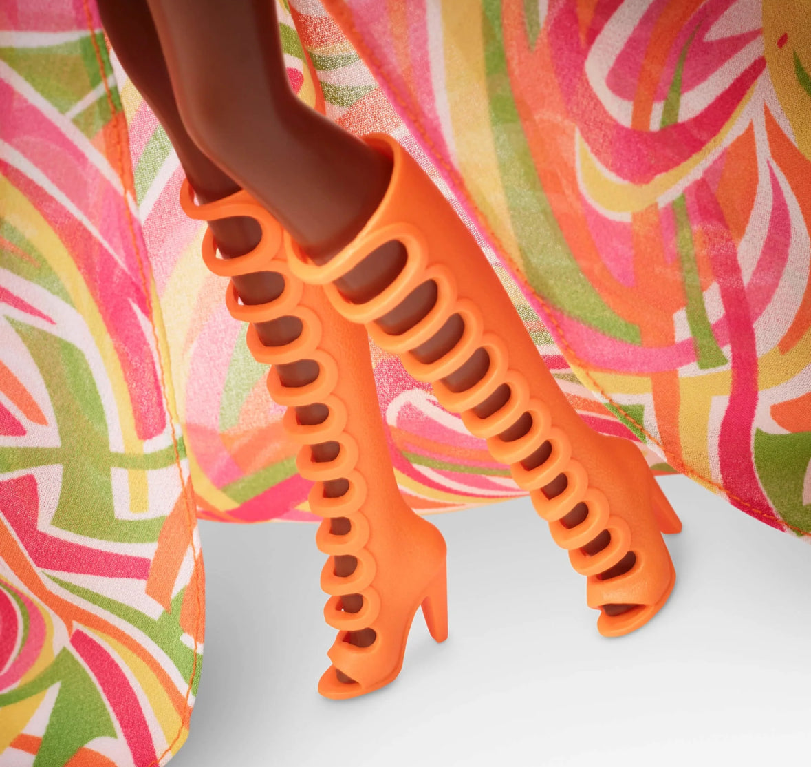In 1968, Christie debuted and quickly became one of Barbie’s BFFs. To celebrate her 55th anniversary, we reimagined one of her beachy looks from the 1960s with modern details. Christie turns heads at a glamorous poolside soirée in a bright orange dress paired with a sheer overlay in a swirling, mod print. Strappy orange boots, golden hoops, and a “C” monogram necklace complement her floor-sweeping high-low look. Gorgeous curls swept back from her face showcase coral-hued makeup that nods to the original doll.