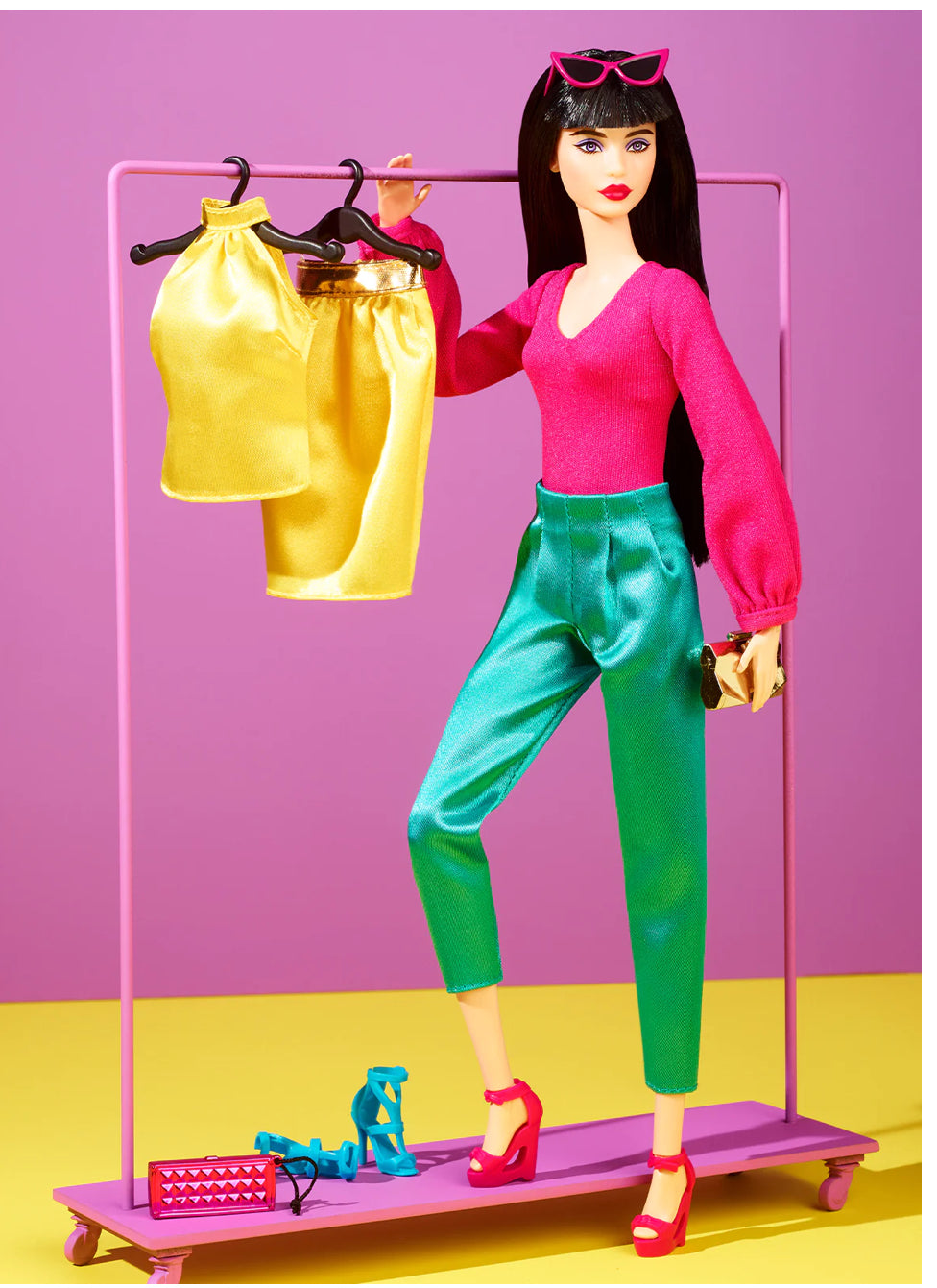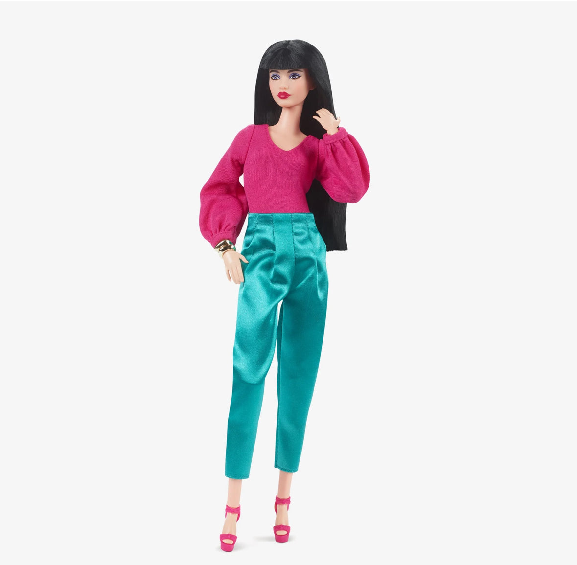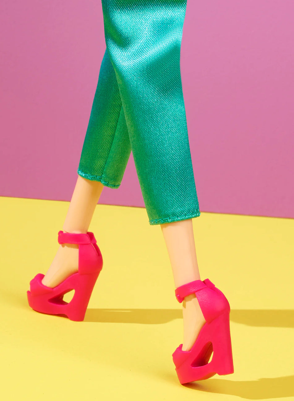 Barbie is the epitome of sophistication in her satiny jewel-toned fashions. Create customizable ensembles with two blouses, tailored pants, and a pencil skirt, as well as trendy accessories: two pairs of heels, two clutches, three bracelets, and bold cat-eye sunglasses. With mix-and-match looks, collectors can style and pose her for at-home photography. Her elegant face sculpt is framed by blunt-cut bangs and accented by a smoky eye and deep red lips.
