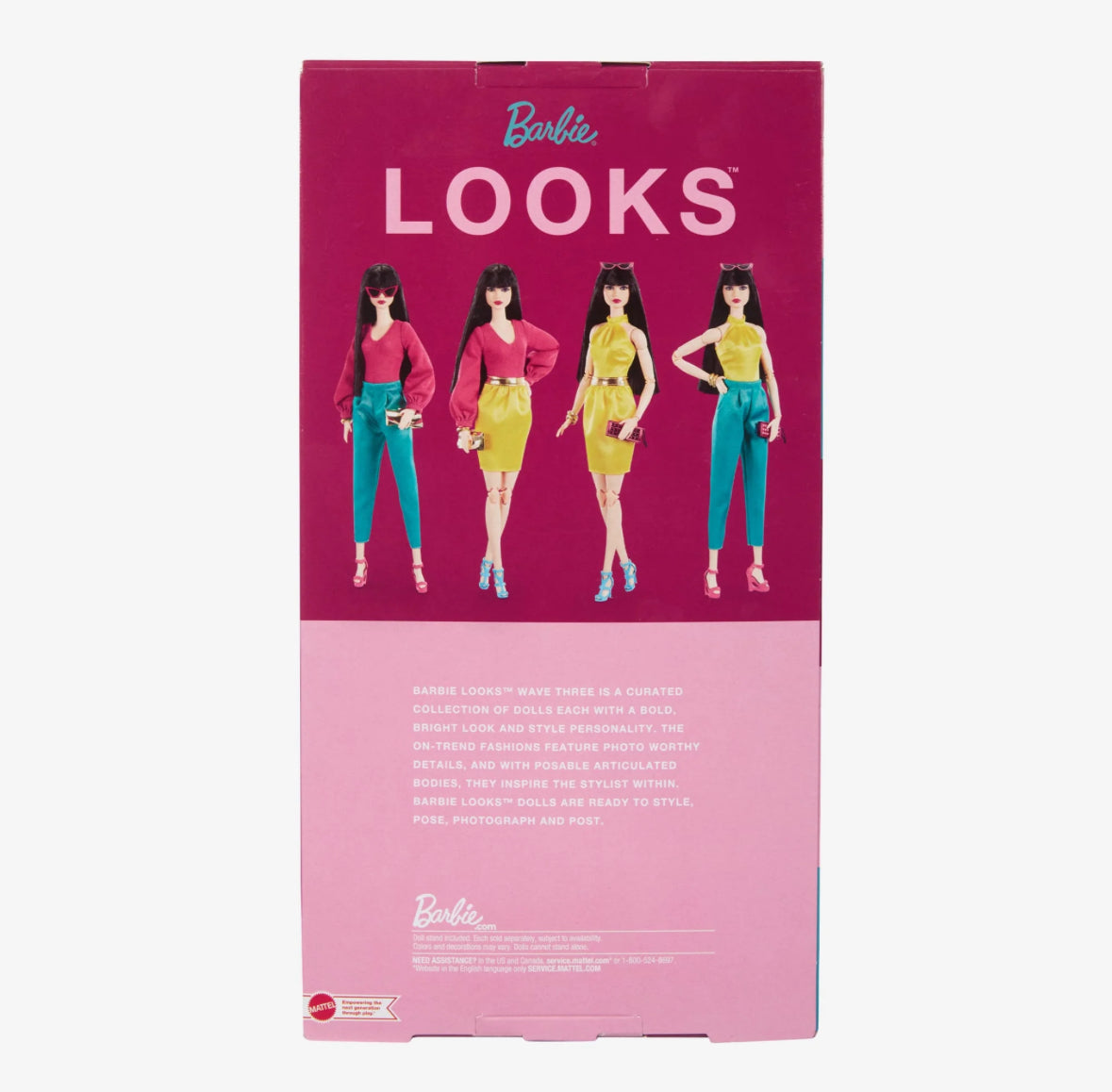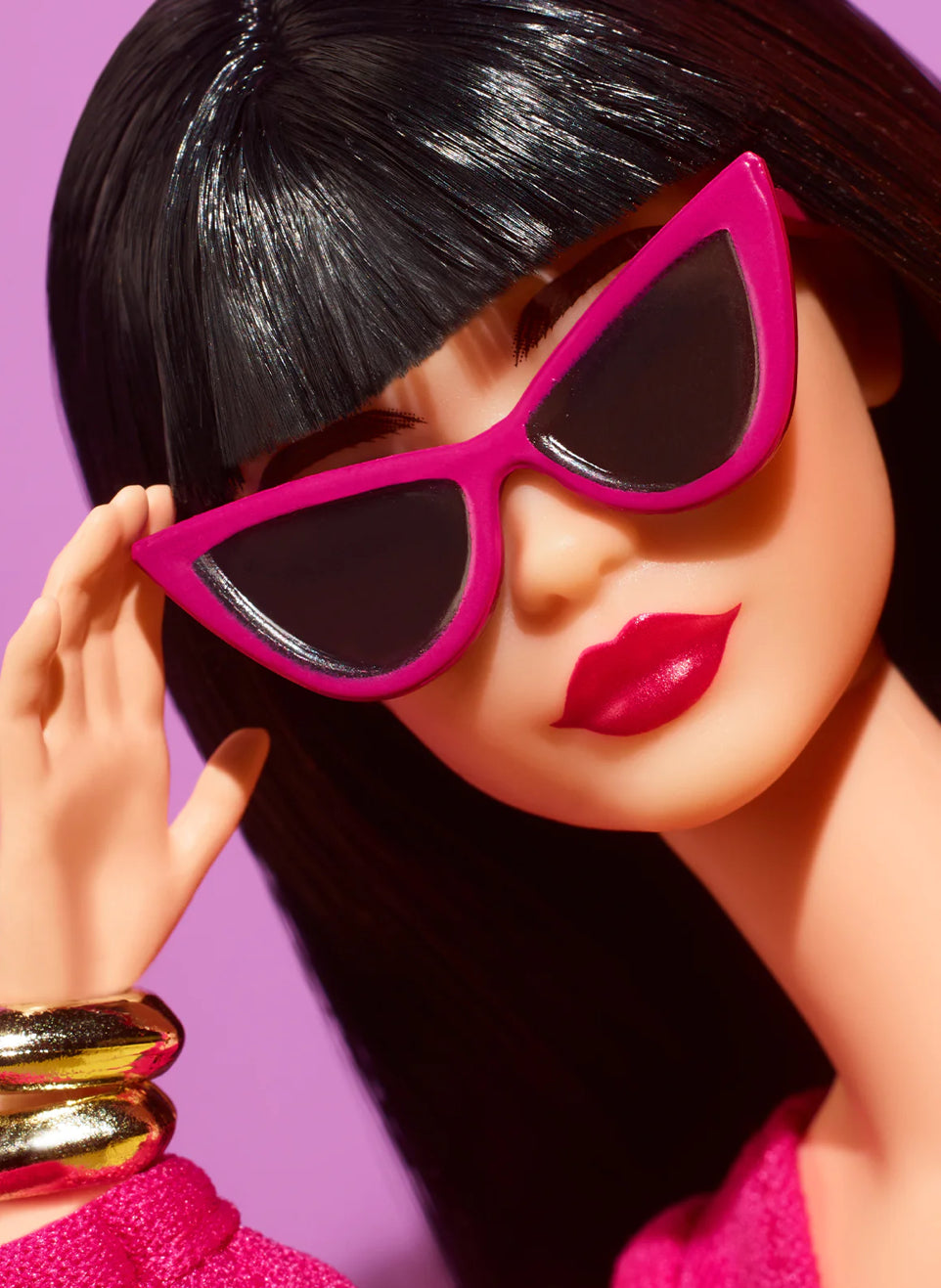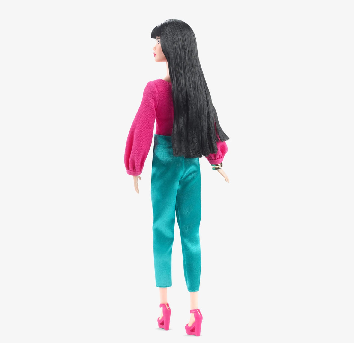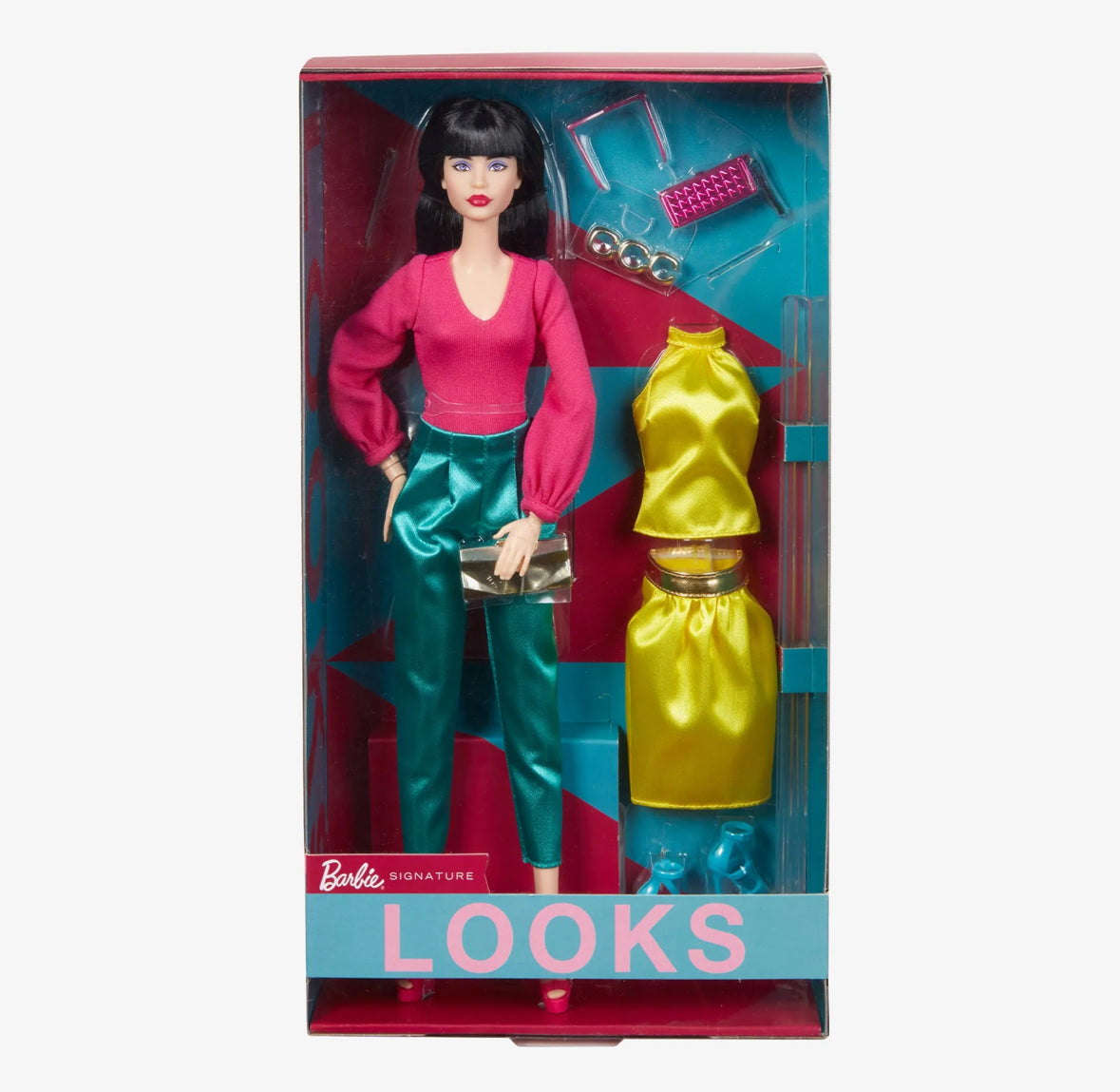 Barbie is the epitome of sophistication in her satiny jewel-toned fashions. Create customizable ensembles with two blouses, tailored pants, and a pencil skirt, as well as trendy accessories: two pairs of heels, two clutches, three bracelets, and bold cat-eye sunglasses. With mix-and-match looks, collectors can style and pose her for at-home photography. Her elegant face sculpt is framed by blunt-cut bangs and accented by a smoky eye and deep red lips.